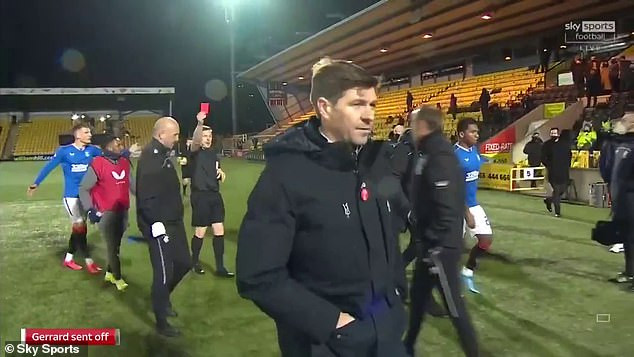 អ្នកចាត់ការ Steven Gerrard របស់ក្រុម Rangers បានទទួលកាតក្រហមបណ្ដេញចេញពីទីលាននៅចប់តង់ទី១ ក្រោយពីលោកតវ៉ាជាមួយអាជ្ញាកណ្ដាលច្រើនពេក។
