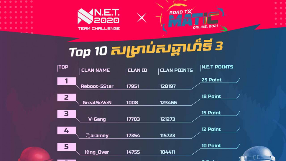 ក្រុមReboot-SStar បានហក់ឡើងឈរលេខ១ កំពូលតារាង នៃការប្រកួតសប្ដាហ៍ទី៣ វគ្គជម្រុះ Team Challenge សន្សំពិន្ទុស្វែងរក Clan ខ្លាំង 8 ទៅប្រកួត N.E.T 2020 ។
